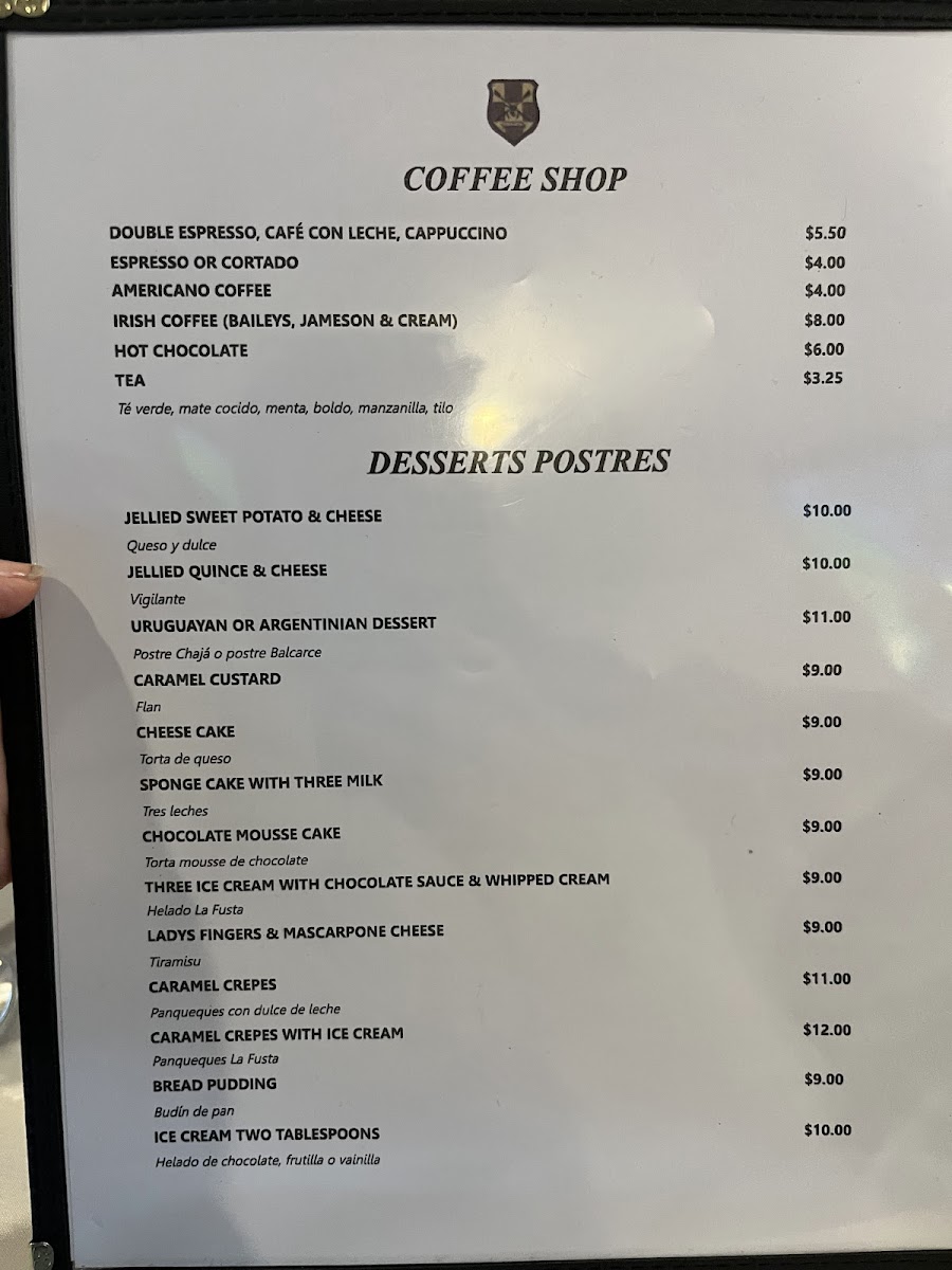 The menu offers a variety of Argentine and steakhouse specialties alongside a selection of beverages. It is structured to provide distinct options for appetizers, main courses, desserts, and drinks, catering to different dining preferences.