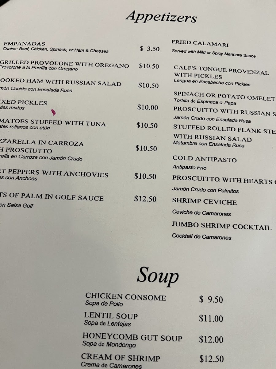 Appetizers include classic Argentine empanadas available in beef, spinach, chicken, and ham & cheese varieties, grilled provolone cheese with oregano, cooked ham served with Russian salad, mixed pickles, tuna-stuffed tomatoes, and mozzarella with prosciutto.